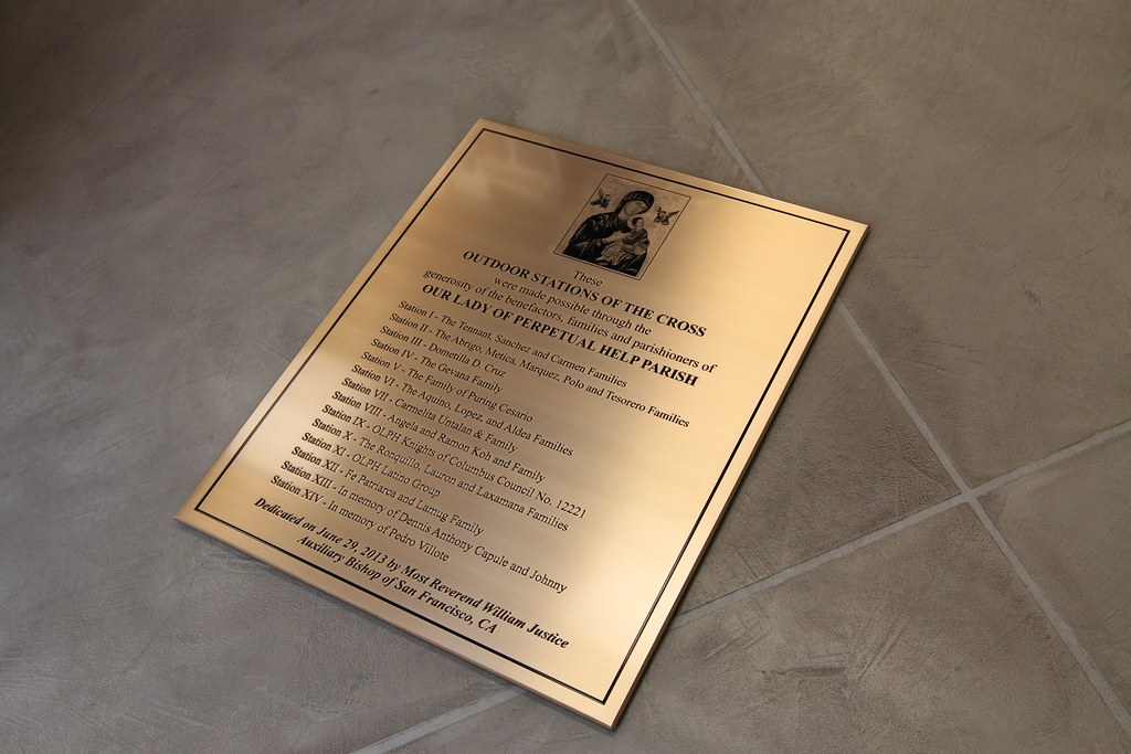 Etched bronze plaque Polished finish. Recessed copy paint filled.