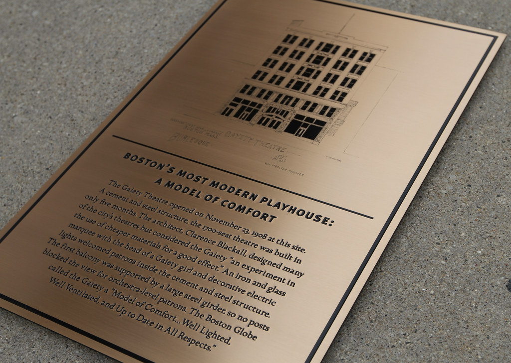 Etched bronze plaques with Polished finish. Recessed copy paint filled.