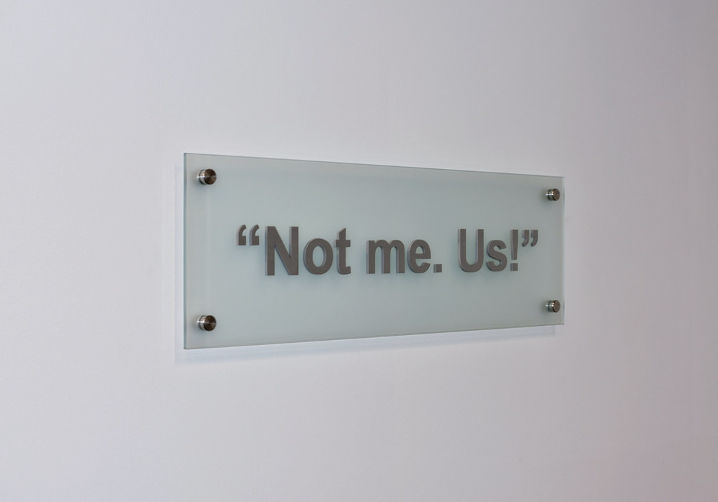 36" x 12" x 3/8" thick Frosted Glass panel with 1/4" thick Brushed Aluminum lettering assembled flush on face and (6) stainless steel standoffs for interior drywall mount COPY: "Not me. Us."