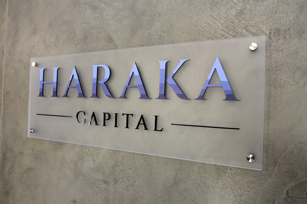 48" Frosted Acrylic Panel with raised acrylic lettering and HARAKA lettering full color digital print on face Includes (4) stainless steel standoffs