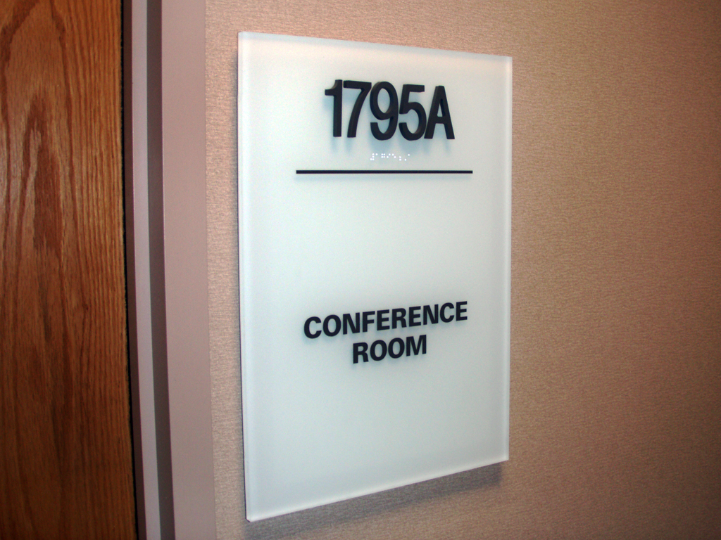 Frosted acrylic sign with raised letters and braille.
