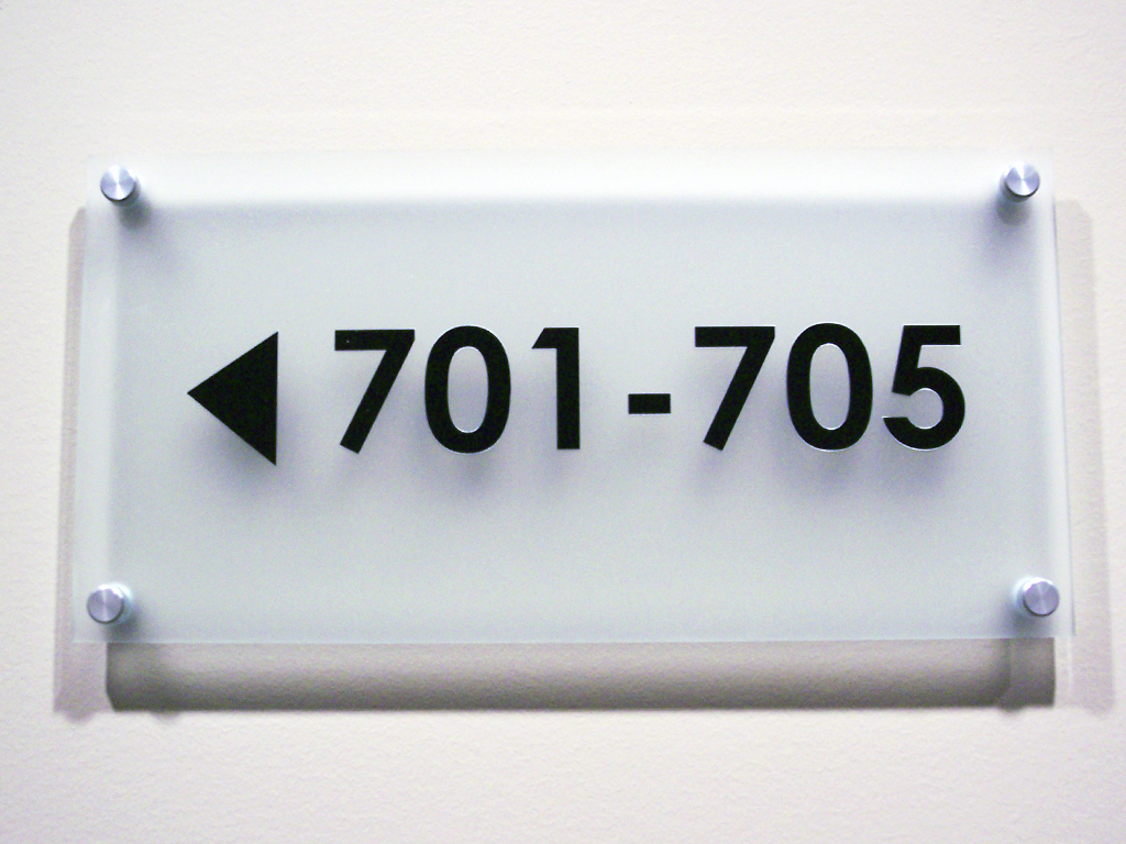 Frosted acrylic sign with raised letters and braille. Installed with stainless steel stand off hardware.
