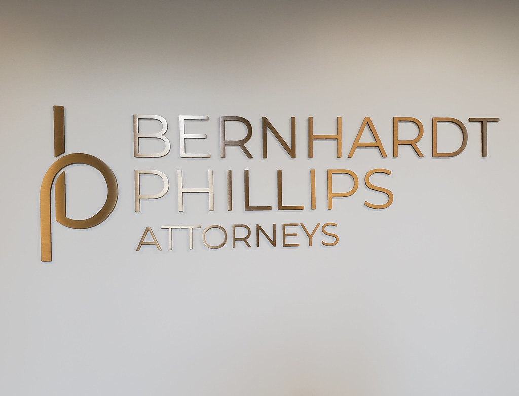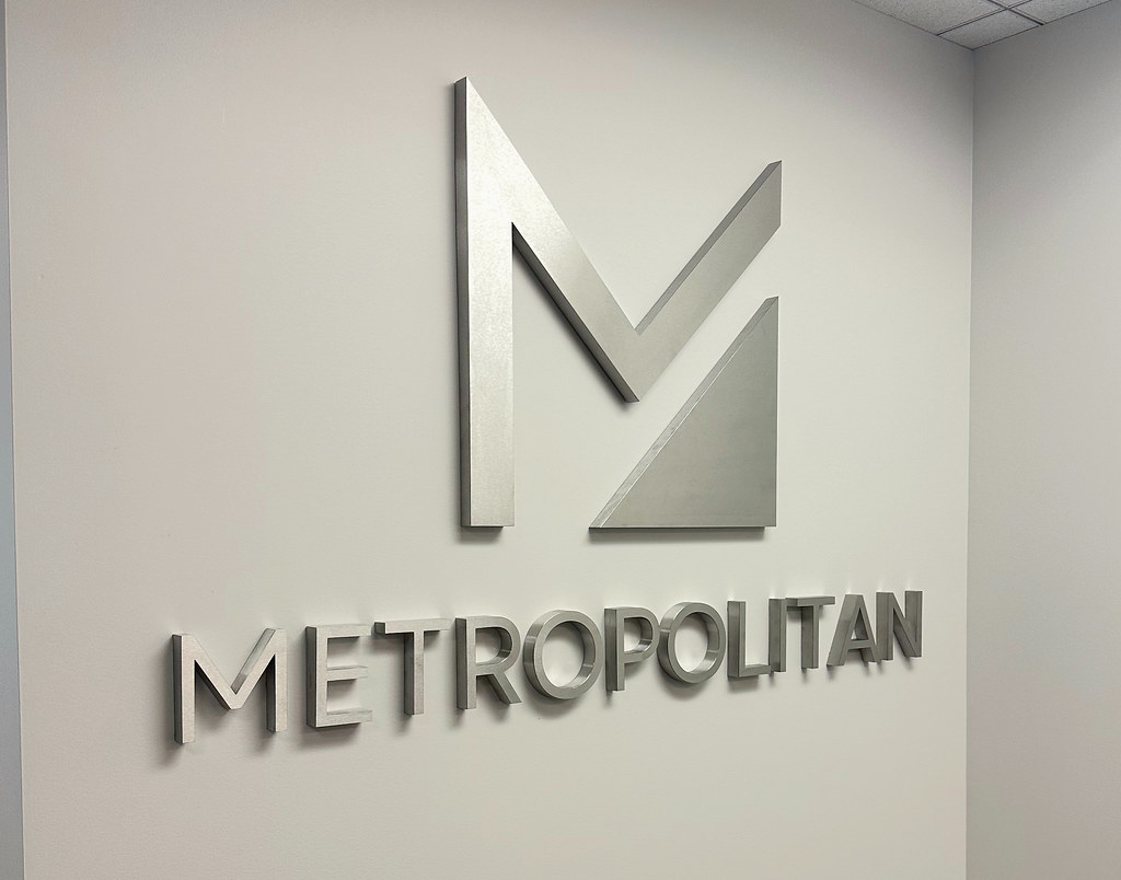 Cut Stainless Steel lettering Arial Font interior drywall lobby