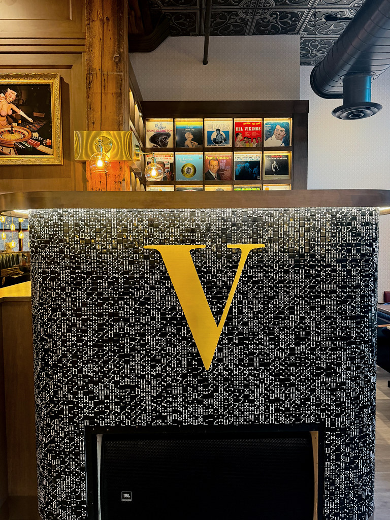 3/8" thick metallic gold acrylic with brushed gold Laminate face lettering. Logo UV print on black acrylic custom shape.